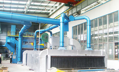 拋丸清理機工作時產(chǎn)生的含塵氣流經(jīng)過管道進入袋式除塵器。含塵氣流在除塵器的作用下形成旋風(fēng),大顆粒灰塵降在灰斗內(nèi),帶有小顆粒的灰塵氣流經(jīng)布袋過濾后,通過高壓離心式通風(fēng)機進入煙筒,排放的粉塵濃度不高于120mm/m3。