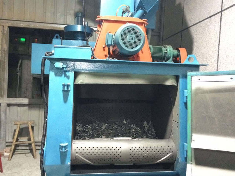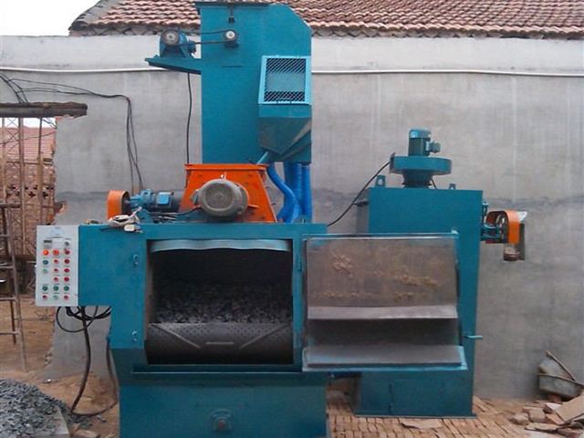 工作原理:在清理室中加入規(guī)定數(shù)量的工件,機(jī)器啟動(dòng)后,拋丸器高速拋出的彈丸形成流丸束,均勻地打擊在工件表面上,從而達(dá)到清理、強(qiáng)化的目的。拋出的彈丸及砂粒,流入提升機(jī)內(nèi),由提升機(jī)提升到分離器中進(jìn)行分離。粉塵由風(fēng)機(jī)吸送到除塵器中過(guò)濾,清潔空氣排入大氣中,布袋上的灰塵經(jīng)機(jī)械振打落入除塵器底部的集塵箱中,用戶可定期清除,廢砂由廢料管流出,用戶可回用。丸砂混合物由回用管收回進(jìn)入室體,待分離器分離后再回用,干凈的彈丸由電磁供丸閘門進(jìn)入拋丸器拋打工件。
